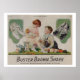 Belle affiche publicitaire vintage pour chaussures Brown Buster. Une belle image d'une petite fille tenant une poupée et un petit garçon admirant ses jolies chaussures.