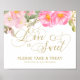 Panneau pour table de desserts élégante ou table des cadeaux avec la mention "l'amour est doux, prenez une friandise". Vous avez également la possibilité d'ajouter un texte personnalisé, tel que "avec amour de la future Mme [nom de famille]". Ce design aquarelle féminin présente des fleurs roses et dorées avec une touche de verdure. Il comporte une élégante écriture manuscrite et une typographie en or, avec "Amour" et "Doux" écrits à la main en calligraphie tourbillonnante. Veuillez parcourir ma boutique pour trouver des articles assortis.