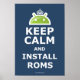 Faites votre déclaration sur l'enracinement de votre Android et l'installation de ROMs personnalisés. Cette affiche frappante dit, "Conserver le calme et installer des ROMs" et contient la mascotte Android en vert sur un arrière - plan bleu. Cela rappelle les vieilles affiches de propagande "Keep Calm and Carry On" produites par le gouvernement britannique en 1939 au début de la Seconde Guerre mondiale, destinées à remonter le moral du public britannique en cas d'invasion.