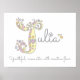 Jolie initiale / art de monogramme personnalisé avec nom affiche parfaite pour la chambre d'une fille ou la salle de jeux dans des nuances de gris, blanc, jaune, rose et violet. Personnalisez avec le nom de votre enfant commençant par J, et la signification du nom pour un toucher vraiment personnalisé pour la chambre ou la nurserie de votre enfant, cet exemple est pour le nom Julia Jeune, romantique avec une touche créative. Impression d'affiche mignonne idéale pour un nouveau-né, un baptême ou un cadeau de shower de bébé. © Dessin de cœurs et de fleurs de monogramme J unique et description et conception graphique par Sarah Trett. www.sarahtrett.com pour www.mylittleeden.com