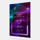 Cosmic Purple Turquoise Sun Moon Stars Affiche de bienvenue L'Affiche de bienvenue acrylique présente le soleil argenté, la lune et les étoiles avec un cadre argent sur coloré mystique violet, turquoise et bleu arrière - plan cosmique. À l'intérieur du cadre est votre texte personnalisé dans un élégant script de calligraphie blanche. Conçu pour vous par ©2024 Evco Studio www.zazzle.com/store/evcostudio