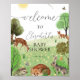 Baby shower de bois moderne et coloré, neutre pour le genre, dans une police élégante avec de mignons animaux et oiseaux de bois dans un pré avec des arbres.