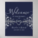 Elégante affiche d'accueil moderne bleu marine mariage avec coeur simple en corde argentée et dentelle dorée fleurie.