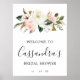 Accueillez vos invités à votre douche de mariée avec cette Affiche de bienvenue élégante pour une douche de mariée, Panneau de bienvenue. Personnalisez avec le nom de la future mariée et la date de la douche de mariée. Le design présente un arrangement luxueux de fleurs de coton et de magnolia.