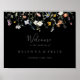 Cette enseigne d'accueil mariage noire multicolore sauvage est parfaite pour un mariage rustique. Le design est composé de fleurs élégantes rose aquarelle, rousse, violette, marine et blanche avec des feuilles vert émeraude dans un arrière - plan foncé. Faites de cette affiche votre propre en ajoutant le nom de la mariée et du marié, ainsi que la date du mariage.