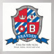 Affiche de lettre monogramme en forme de bouclier de style chevaleresque, lettre B, idéale pour la chambre ou la salle de jeux d'un garçon dans des tons de rouge, bleu, blanc et gris. Personnalisez avec le nom de votre enfant et la signification de son nom pour un effet personnalisé dans la chambre ou la nurserie de votre enfant, cet exemple est pour le nom Brayden "de la large vallée". Large, courageux, intelligent et sage. Impression d'affiche idéale comme cadeau pour un nouveau-né, pour un baptême, une cérémonie de nomination ou une fête prénatale. Dessin de bouclier unique, art graphique, recherche de nom, formulation et conception par Sarah Trett. www.sarahtrett.com pour www.mylittleeden.com
