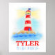 Affiche nautique pour enfants de phare d'art aquarelle. Idéal pour les chambres de futurs capitaines ou les nurseries sur le thème nautique. Personnalisez cet article avec le nom de votre enfant (jusqu'à 7 lettres) et un message de votre choix. Cet exemple indique : TYLER Vous illuminez notre vie. Une excellente idée de cadeau pour les nouveau-nés garçons et les fêtes de bébé garçon. Peint de manière unique à l'aquarelle et conçu par Sarah Trett.