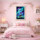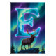 Apportez une beauté nordique éclatante à vos murs avec ce poster de la lettre E aurorale. Une lettre E lumineuse s'élève au-dessus d'une forêt enneigée, illuminée par des rubans fluides de lumières boréales dans des nuances riches d'émeraude, de turquoise et de violet. L'aurore scintille dans le ciel nocturne, jetant une douce lueur sur le paysage hivernal calme et éclairant doucement l'élan paisible debout royalement à la base du monogramme.