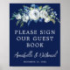Un soir floral de pivoine blanc et bleu marine gras Veuillez signer notre affiche de livre d'or pour un mariage d'hiver moderne. Un élégant spray botanique de feuilles vertes se déploie au-dessus d'un script manuscrit blanc tendance pour un panneau d'événement moderne magnifique pour votre livre d'or.