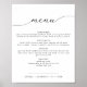 Cette affiche de menu de mariage imprimable présente une police de calligraphie élégante et un design minimal moderne avec un texte entièrement modifiable. Changez facilement les polices, les couleurs des polices et la couleur de fond pour correspondre au style de votre événement. La combinaison de couleurs simple en noir et blanc en fait l'ajout parfait à tout événement. Utilisez cette affiche pour votre réception de mariage, douche de mariée, douche de couple, etc.