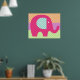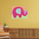 Une affiche colorée de nurserie présente un éléphant rose vif avec des oreilles à points sarcelle et blanc et un fond avec des points orange, lavande et vert.