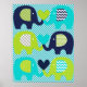 L'affiche de nurserie Elephant Love présente six éléphants en bleu marine, bleu sarcelle et vert citron avec des bandes chevron imprimées, des fleurs et des oreilles pointillées sur un fond à rayures diagonales bleu et blanc !