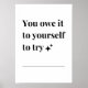 Besoin d'un peu de pression pour essayer plus fort ? Cette oeuvre d'art a été faite pour vous rappeler que peu importe l'impuissance que vous voulez atteindre semble, vous devez essayer pour vous. Il sera votre compagnon dans votre séance de travail de fin de nuit et vous encouragera quand vous voudrez abandonner. Si au bout du compte vous n'obtenez pas le résultat souhaité, soyez heureux que vous ayez essayé pour vous. Vous pouvez le commander sous forme d'impression ou le télécharger et l'imprimer à la maison. Faites-le le vôtre aujourd'hui ;) Profitez-en ! **Ce produit n'est destiné qu'à un usage personnel**