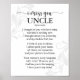 "Poème 'Tu me manques' : 'Je t'ai pensé avec amour aujourd'hui, mais ce n'est pas nouveau. Je pensais à toi hier et les jours précédents aussi. Je pense à toi en silence. Je prononce souvent ton nom. Tout ce que j'ai, ce sont des souvenirs et ta photo dans un cadre. Ton souvenir est mon trésor dont je ne me séparerai jamais. Dieu te garde dans sa protection, je t'ai dans mon cœur.'" Parfait pour se souvenir d'un oncle bien-aimé.