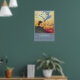 Affiche de voyage colorée et abstraite de la Californie, avec un couple donnant sur une vue sur les arbres et les montagnes.