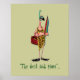 Une aquarelle originale d'Anne Ormsby représentant un flamant se rendant à la plage orne cette affiche amusante.