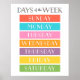 Cette affiche éducative des jours de la semaine est parfaite pour une salle de classe ou un cadre d'école à la maison. Elle comporte 7 cases avec des couleurs vives et une police manuscrite. Parfait pour le calendrier du matin ou la décoration.