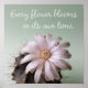 Affiche de citation inspirante. Affiche Every flower blooms in its own time. Affiche de citation motivationnelle décorée d'une image de cactus avec une belle fleur rose pâle à blanche en pleine floraison.