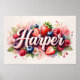 Célébrez la douceur et le charme avec ce poster personnalisé au nom Harper, écrit en élégante écriture 3D, entouré de fruits vibrants aquarelles et d'éléments floraux doux. Fraises juteuses, myrtilles, framboises et fleurs délicates se réunissent dans un arrangement botanique de rêve — parfait pour les nurseries, les chambres d'enfants ou les cadeaux d'anniversaire.