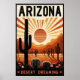 • Cette affiche vintage de voyage en Arizona capture la beauté sereine du paysage désertique avec ses grands cactus saguaro emblématiques et un coucher de soleil audacieux qui irradie de chaleur. Les tons riches font ressortir l'essence du paysage désertique de l'Arizona, créant une atmosphère nostalgique et art déco rappelant les affiches de voyage classiques des années 1930.