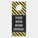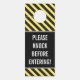 Cette conception comporte le message "S'IL VOUS PLAÎT, COUCHEZ AVANT D'ENTRER!" en gras blanc, ainsi que des bandes d'alerte jaune et noir.