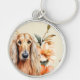 A beautiful watercolor portrait of an Afghan Hound dog sitting against lovely peach colored lilies flowers creating a lovely keychain and one the dog lover would love to receive as a gift.