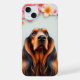 Beautifully detailed portrait of a dog, probably an illustration of a hound breed, positioned centrally against a light background. Its fur is long and flowing, predominantly in shades of brown and black. Surrounding the dog is a vibrant floral arrangement, consisting of various flowers in soft pinks, yellows, and whites, along with green leaves. The flowers create a cheerful and colourful frame around the dog, enhancing the overall aesthetic of the image. The composition has a whimsical and artistic feel, conveying a sense of warmth and affection.