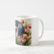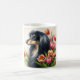 A mug for drinking coffee or tea, with a black and tan afghan hound and tulips on it!