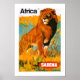Vintage air travel poster for Sabena Airlines services to Africa featuring a majestic lion in the wild.
