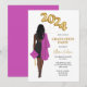 Graduation Party Invitation female portrait drawing black dress, pink cap and gown, long dark hair. 2024 gold balloons.