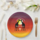Stylish destination Kenya wedding paper plates for couples getting married abroad in the Africa or having an African themed wedding party. With love heart and script text lovely sunset background in tones of yellow, orange and purple with two giraffes in front; very stylish and easy .o customize with your personal names and message.