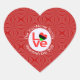 Heart shaped sticker has the African American or African Diaspora LOVE FLAG. The word LOVE is featured in red letters inside a white, fractal circle of squiggly squares. The circle sits on a red, fractal background, also, of squiggly squares. Great for your guests at your next occasion or party to celebrate African America. Can be customized for any occasion.