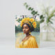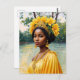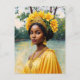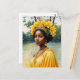 Postcard features stunning, regal, brown-skinned orisha, Oshun (aka Osun) - river goddess of divinity, femininity, fertility, beauty, and love wearing a gold crown, floral headdress, gold jewellery, and an elegant golden yellow dress with nature background featuring a body of water. A melanin royalcore aesthetic classic oil painting style portrait of a divine beauty and African deity.
