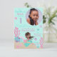 Little mermaid first birthday invitation card with underwater creatures with photo insert template.
