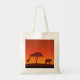 African safari landscape background featuring silhouettes of a giraffe, a tree and an elephant against the sunset in orange and red colour shades.