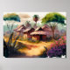 African Village surrounded by beautiful flowers and trees Watercolor Digital Art poster.