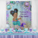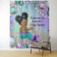 Afro Mermaid baby shower backdrop with adorable African American mermaid with cute afro hair on a beautiful jewel background. This African American mermaid baby shower banner banner is easily customized for your event by simply adding your text in the font style and colour you prefer. You can also choose the size.
