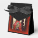 A bold and festive touch to your holiday gathering! This Afrocentric Christmas Favour Box features a photo image of a contemporary holiday tree made from a dress form dark-skin mannequin. The bodice is a short-sleeved sequined red dress and the bottom is made from artificial greenery decorated with red streamers and ornaments of purple, red and gold. The dress form has a big, bold necklace and matching bracelet with the same colour scheme. The African-American-style dreadlocks complete the fashion statement. A black Christmas tree silhouette stands in the background. Text may be added for personalization at no additional charge! Photography by Glenda Motsavage, a Florida-based travel writer and author.