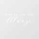 Impress your guests with this stylish wedding window cling by JessicaAmber. This sticker features elegant white lettering, which says, 'After all this time? Always'. The script font is Emeline, the serif font is Cormorant. Apply this cling to the window of your venue, or on a decorative mirror.