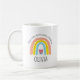 Cute mug with a pink, yellow and blue rainbow with a little heart shaped red flower with green leaves. Over the rainbow in black curved text reads, "After every storm comes a rainbow" below the image is a template to add your name to personalize.