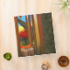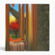 After the wind a single fallen leaf lies where it fell on a silent wind chime. On the ground beneath the still-green grass is covered with yellow and red leaves. In the background a crimson and gold autumn orchard reflects its colours in the silver bars of the chime.