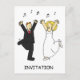 A cartoon bride and groom dancing, with the word 'INVITATION' written underneath.