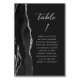 The left-hand edge of this elegant modern wedding table number card features a black watercolor agate border trimmed with faux silver glitter. The word "table" appears in silver grey handwriting script on an off-black background. Add the names of your guests who are assigned to each table.