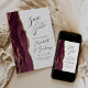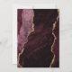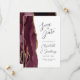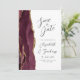The left-hand edge of this elegant modern wedding save the date card features a burgundy red watercolor agate border trimmed with gold faux glitter. The customizable text combines charcoal grey handwriting, copperplate and italic fonts on a white background. The reverse side features a matching burgundy and gold agate design.