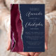The left-hand edge of this elegant modern wedding invitation features a burgundy watercolor agate border trimmed with faux silver glitter. The customizable text combines script and sans serif fonts in real silver foil on a navy blue background. The reverse side features a matching agate design.