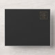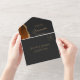 The left-hand edge of this elegant modern all-in-one wedding invitation and RSVP features a burnt orange watercolor agate border trimmed with faux gold glitter. The customizable text combines gold-coloured stylish calligraphy script and sans serif fonts on a slate black background. The return address appears on the outside flap and the reverse side of the detachable RSVP card in gold-coloured text on solid slate black.