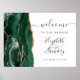 This elegant modern wedding welcome sign features an emerald green watercolor agate design trimmed with faux gold glitter. Easily customize the charcoal grey text on a white background, with the names of the bride and groom in whimsical handwriting calligraphy over a large, pale green ampersand.