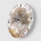 The face of this clock features a brown and white agate geode photo. The centre of the photo is filled with quartz crystal druzy. The numbers, 12, 3, 6 and 9 mark the quarter-hours.