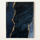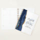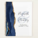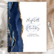Cet élégant wedding planner moderne présente une aquarelle bleu marine ornée d'une parties scintillant en faux or. Customisez facilement le texte gris fusain sur un arrière - plan blanc, avec les noms de la mariée et du marié en calligraphie manuscrite sur une grande et pâle amande bleue. Ajoutez le titre et la date du mariage ci-dessous en italique. La couverture arrière est assortie d'un design d'agate bleu et or.