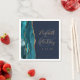 These elegant modern wedding napkins feature a teal watercolor design trimmed with faux gold glitter. Easily customize the gold-coloured text on a navy blue background, with the names of the bride and groom in handwriting calligraphy over a large ampersand.